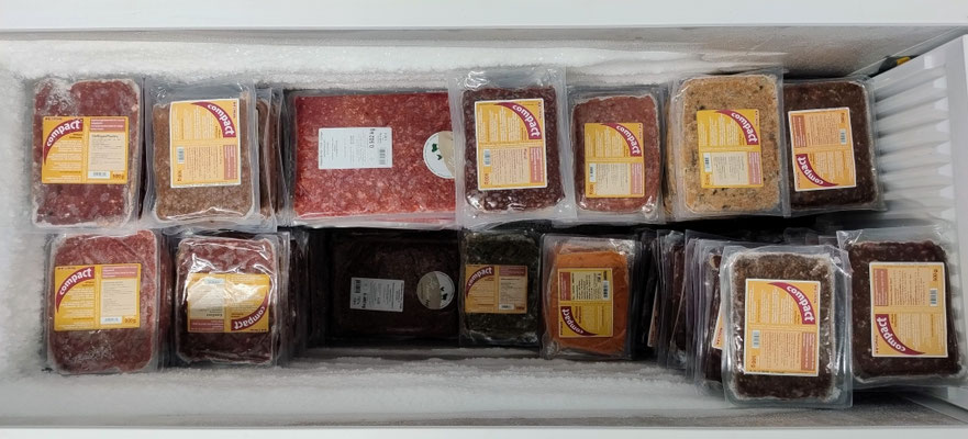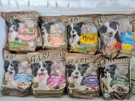 Großer Beliebheit erfreuen sich auch unsere BARF Komplettmenüs BARF in one in 8 verschiedenen Sorten.